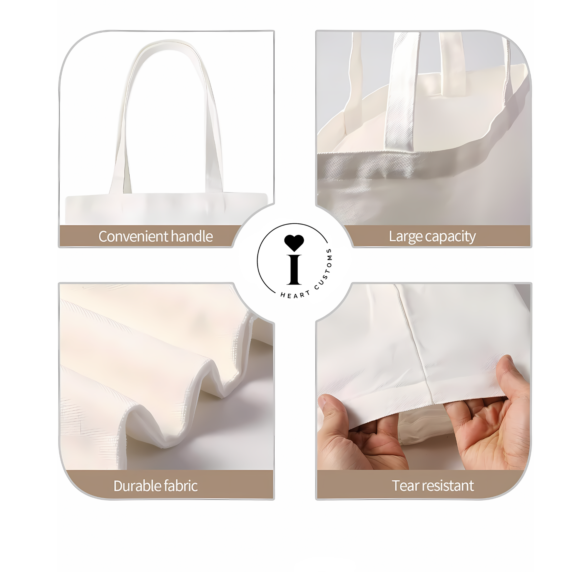 Our premium white canvas tote bag is the ideal blank canvas for your custom DTF transfers! Crafted from high-quality, durable material, this bag is made to showcase your unique designs beautifully, making it perfect for crafting, custom orders, or small business branding. The smooth, even surface allows for vivid, detailed DTF prints that stand out, whether you’re creating bold logos, intricate patterns, or colorful artwork. With sturdy handles and a roomy interior, this tote combines style, functionality, and endless creative potential. Make it your own masterpiece—perfect for personalization with DTF transfers!