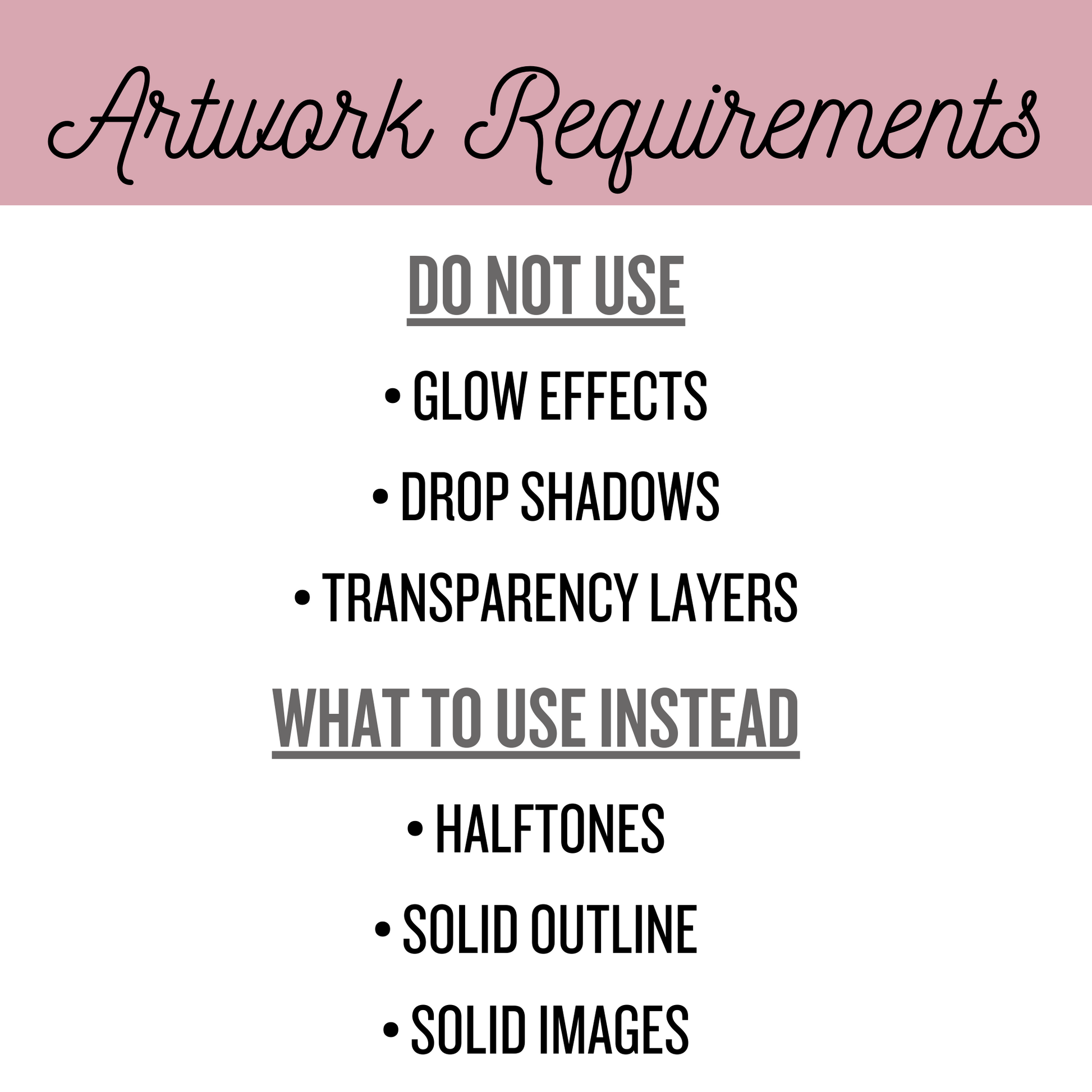 Transparency/drop shadow effects: Transparency (see through) effects and drop shadows do not work for DTF. Please take off any shadow or gradient effects as it will not print as you see on the screen. If your image consist of them, they will not transfer properly to your garment.