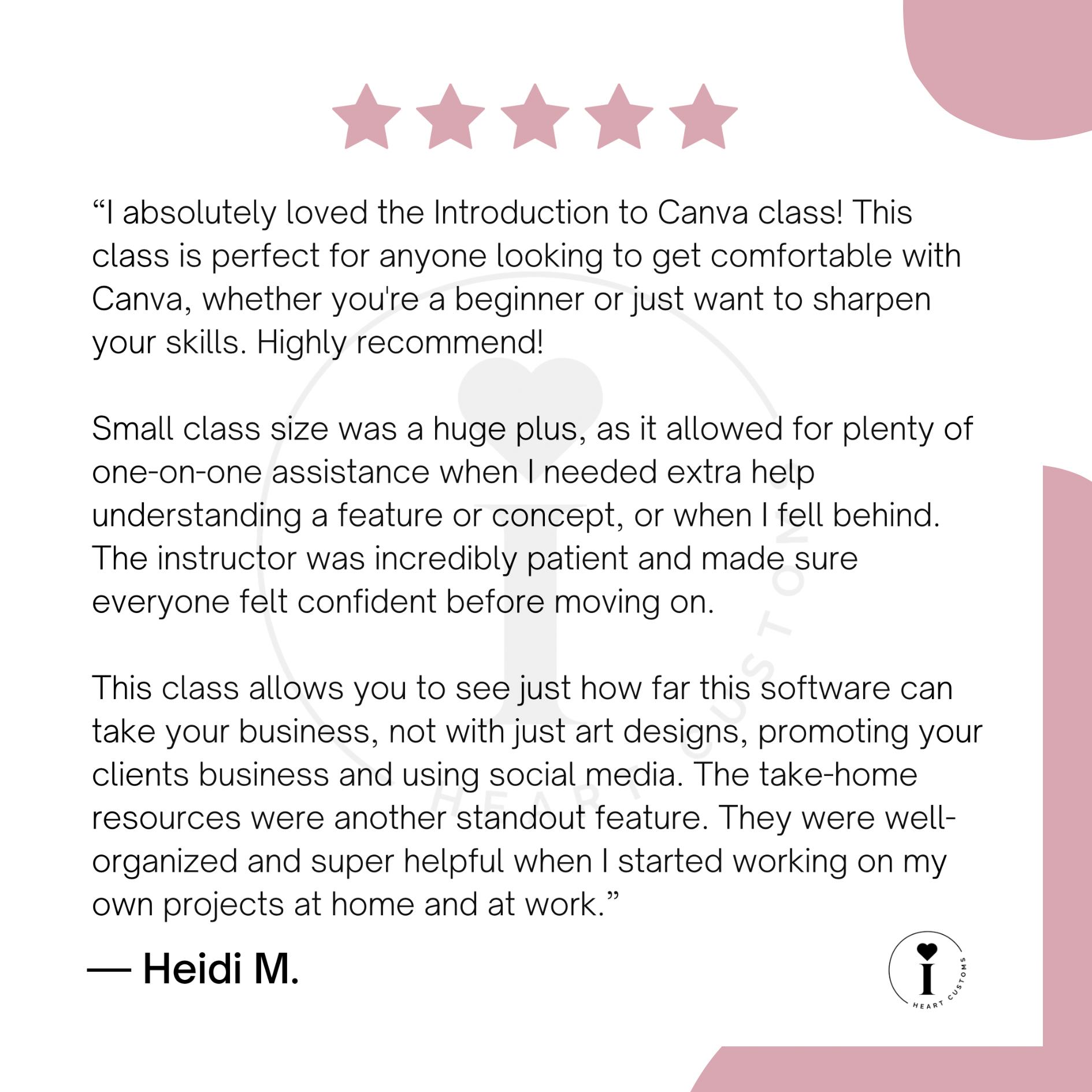 With only 5 seats available per class, this intimate Canva course ensures a personalized learning experience. Don’t miss your chance to level up your skills and make your designs shine!